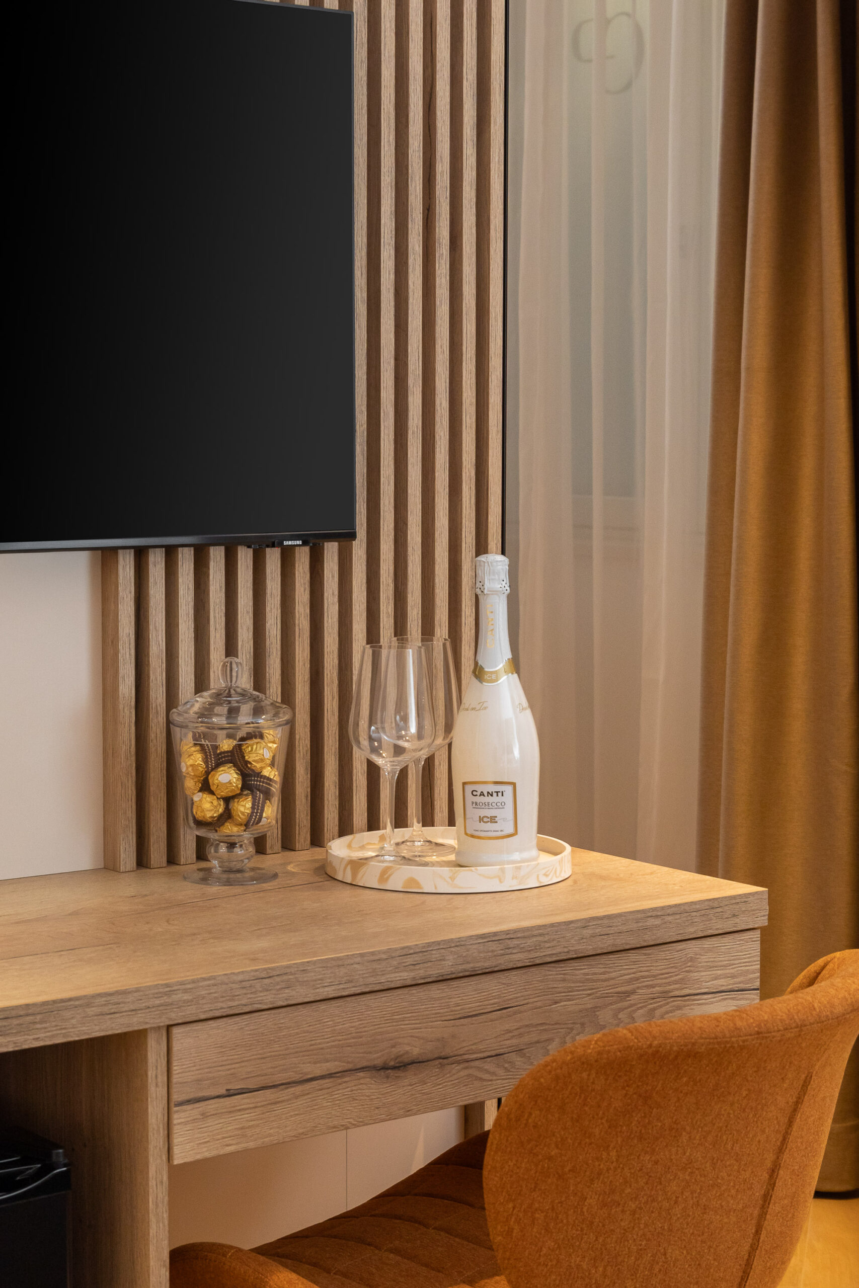 The room has a double bed, a modern private bathroom, contemporary computer desk with a minibar, air conditioning and smart TV.