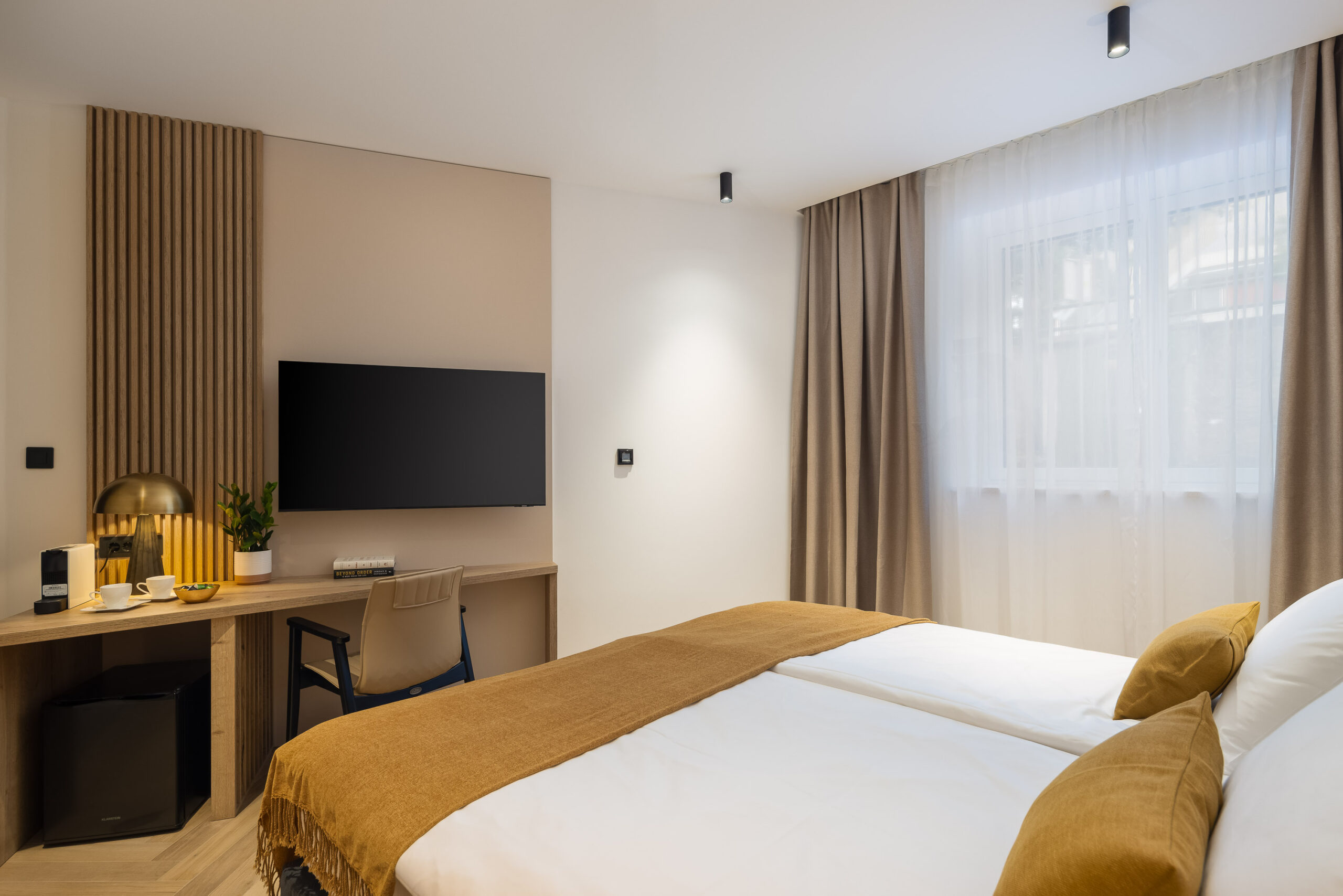 The room has a double bed, a modern private bathroom, contemporary computer desk with a minibar, air conditioning and smart TV.